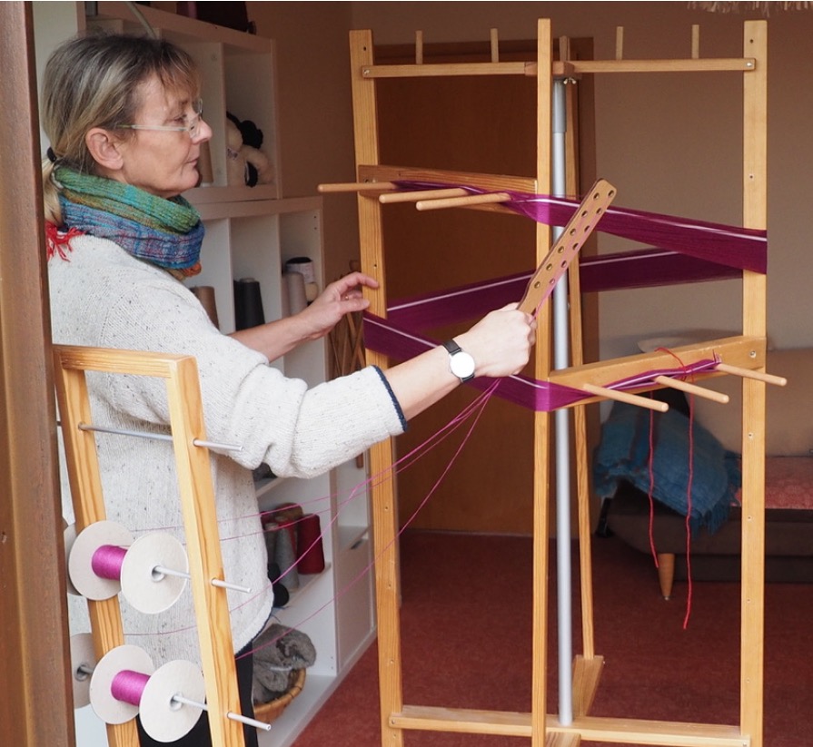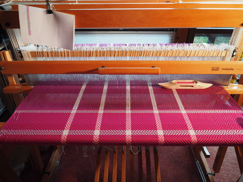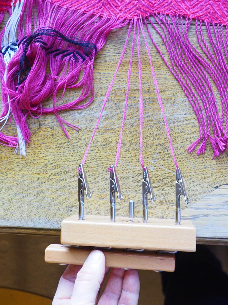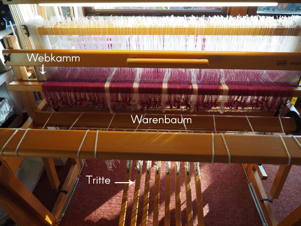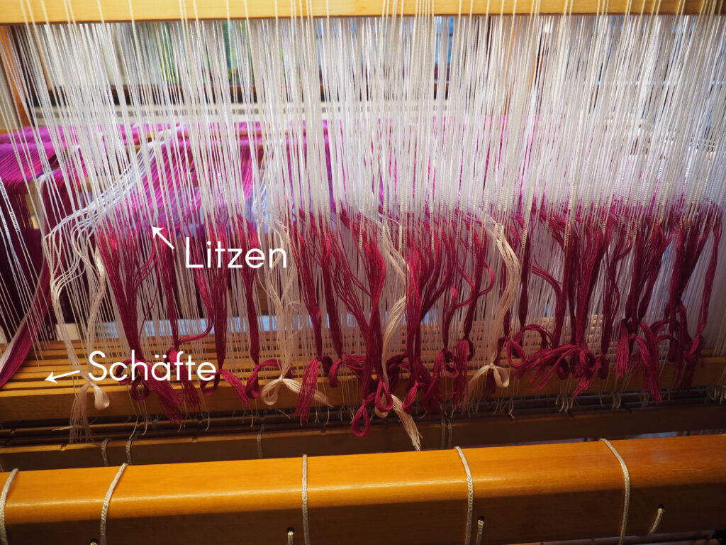 Der Prozess des Aufbäumens, Litzeneinzugs, Blattstichs, Tritte Aufbindens und Anbindens hat fast vier Stunden gedauert.