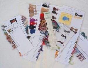 Farbkarten mit Faserproben werden ausgelegt, um Ideen zu bekommen.