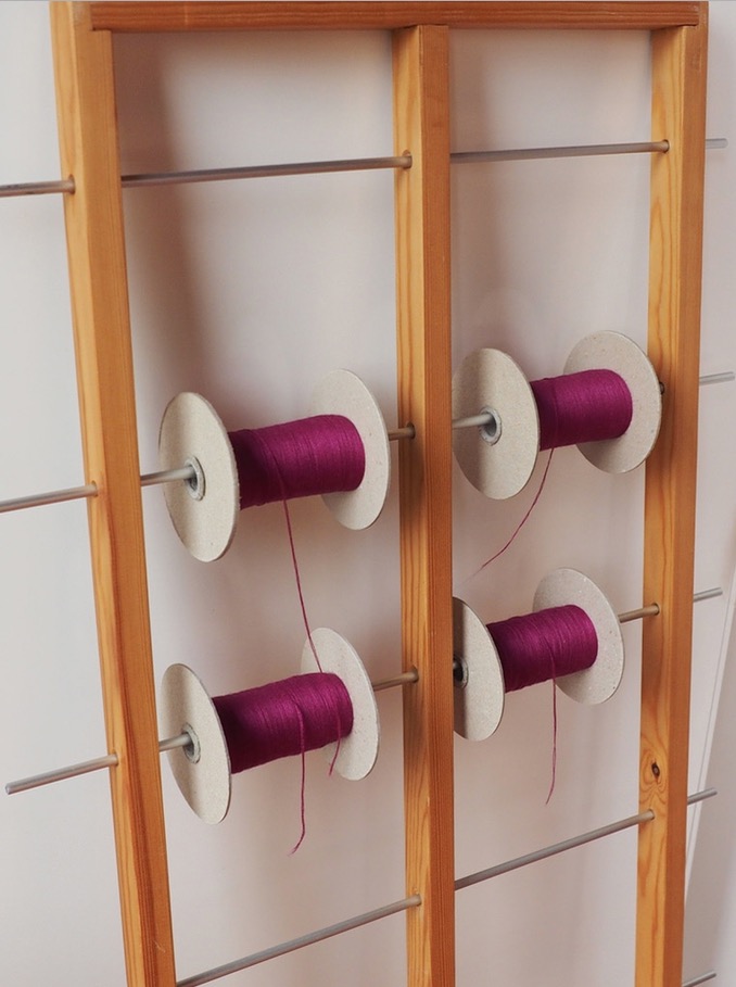 Das Vorbereiten der Spulen und Scheren der Kettfäden dauert bei diesem Tuch knapp eine Stunde.