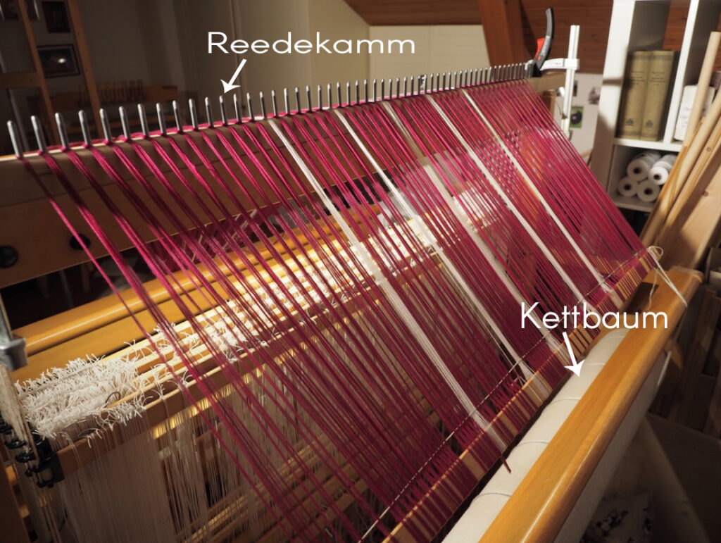 Nach dem Scheren kommt die Kette auf den Webstuhl. Die Fäden werden hinten am Kettbaum befestigt und in den sogenannten Reedekamm auf dem Webstuhl eingelegt. Der Reedekamm bringt die Kette auf die berechnete Breite.