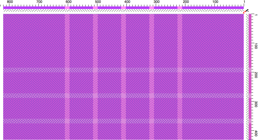 Die Kettfäden, kurz Kette genannt, plane ich in dem dunkleren Brombeerton, unterbrochen von Streifen in blassem Rosa. Dazu brauche ich einen Scherplan, der mir anzeigt, wie viele Fäden ich in welcher Farbe und Reihenfolge scheren muss. Scheren bedeutet, alle benötigten Fäden auf die exakt gleiche Länge zu bringen. Dies kann beispielsweise mit Hilfe eines Scherbaums gemacht werden.