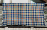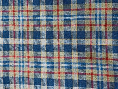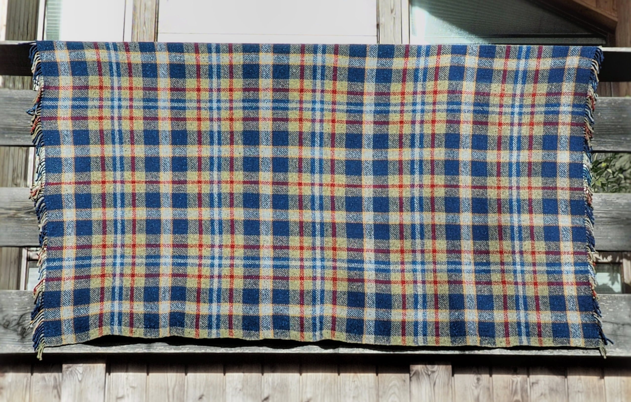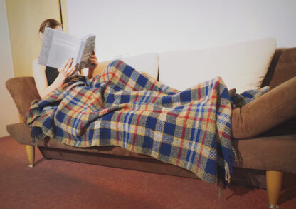 County Kildarei ist der Name eines Tartanmusters, das als Inspiration für diese Decke diente. Sieben verschiedene Farben wurden für dieses Muster verwendet: zwei verschiedene Blautöne, Schilfgrün, Hellbraun, Hellgrau, Gelb und Rot.