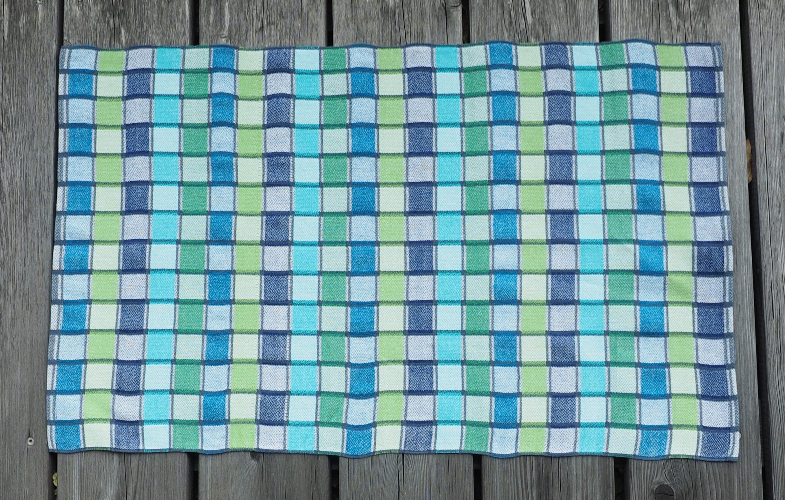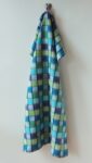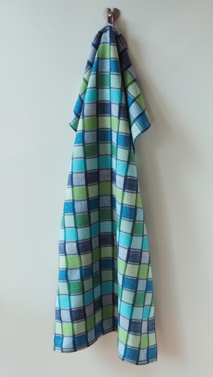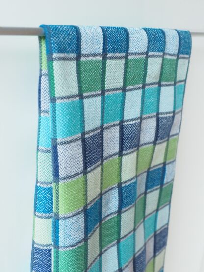 Kühle, freundliche Blau- und Grüntöne wurden in dem streng geometrischen Geschirrtuch aus reiner Baumwolle vereint. Der leicht gewellt Rand des Tuchs ist dem Webmuster geschuldet. Der Aufhänger des Geschirrtuchs ist ebenfalls handgewebt.