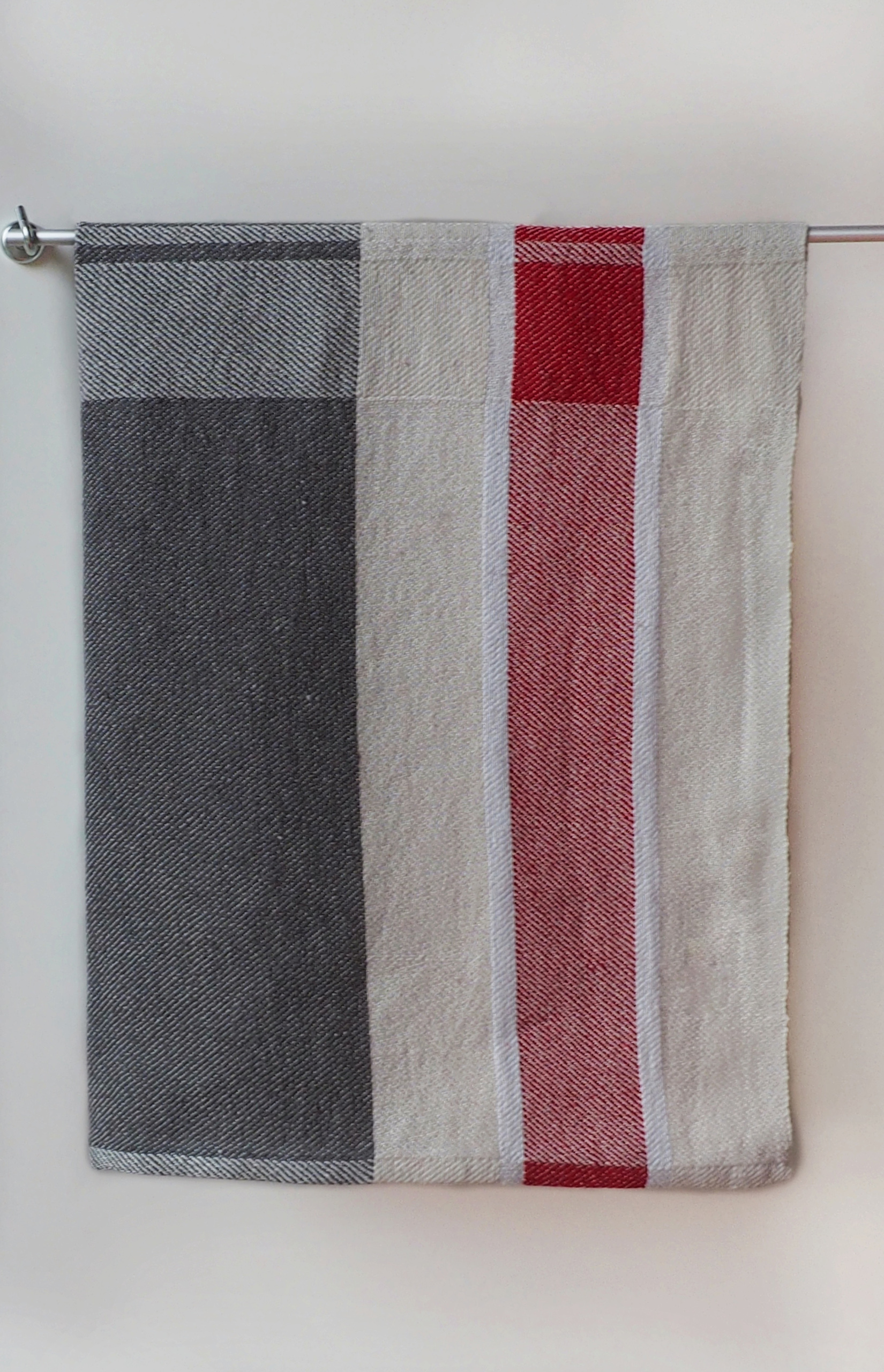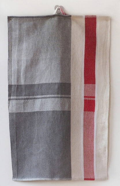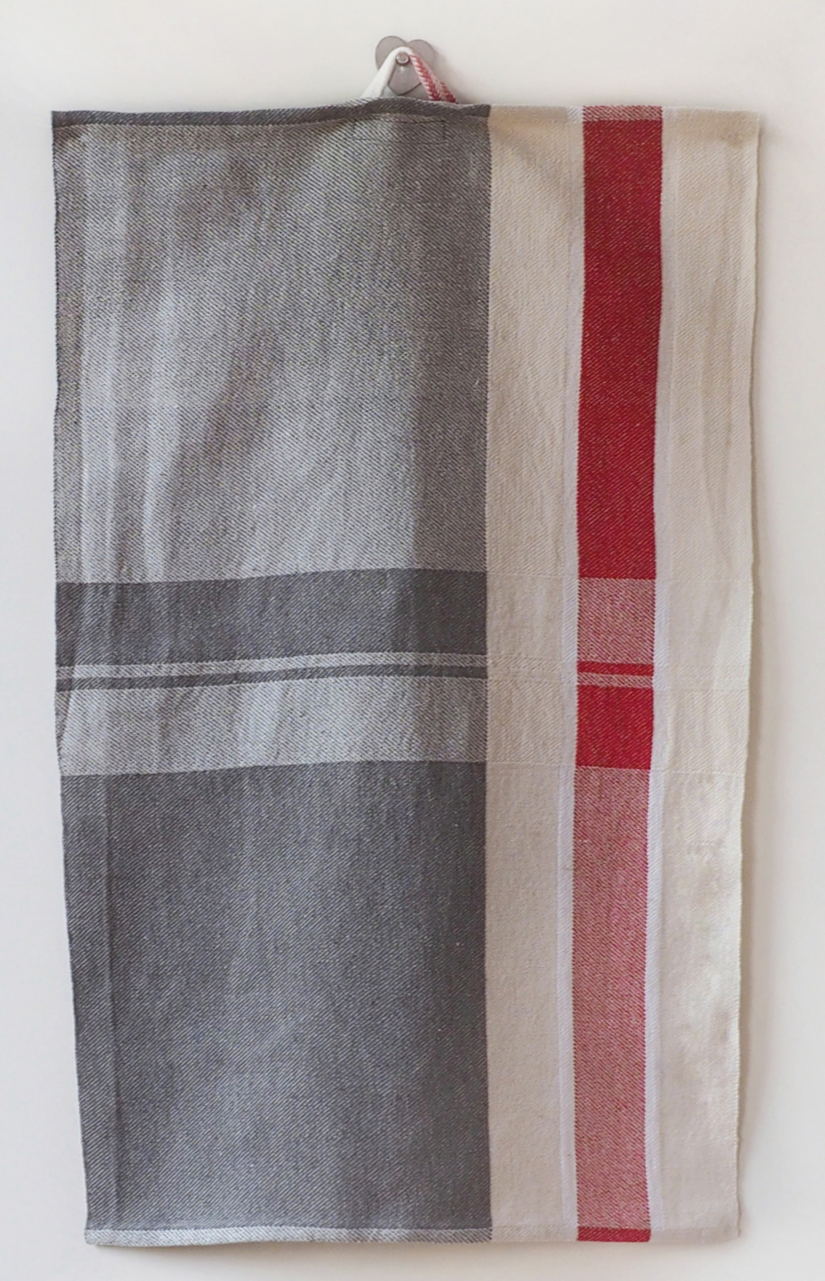 Dieses Geschirrtuch wurde mit einem festen Leinengarn in Naturfarbe gewebt. Es ist das erste aus einer Serie von vier Tüchern, die alle mit dem gleichen Garn, jedoch in unterschiedlichen Mustern und Längen gewebt wurden.