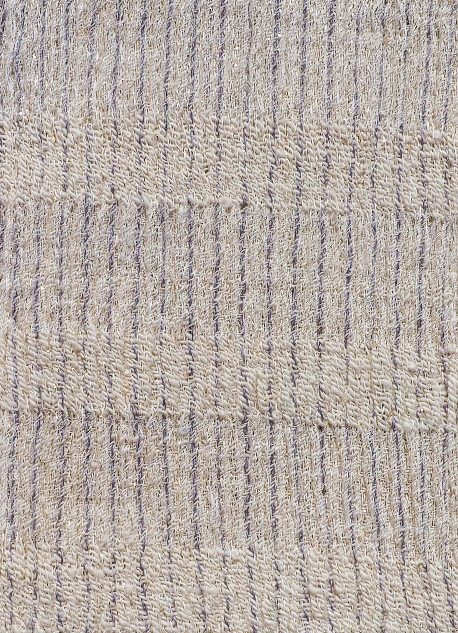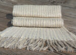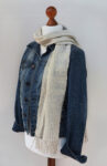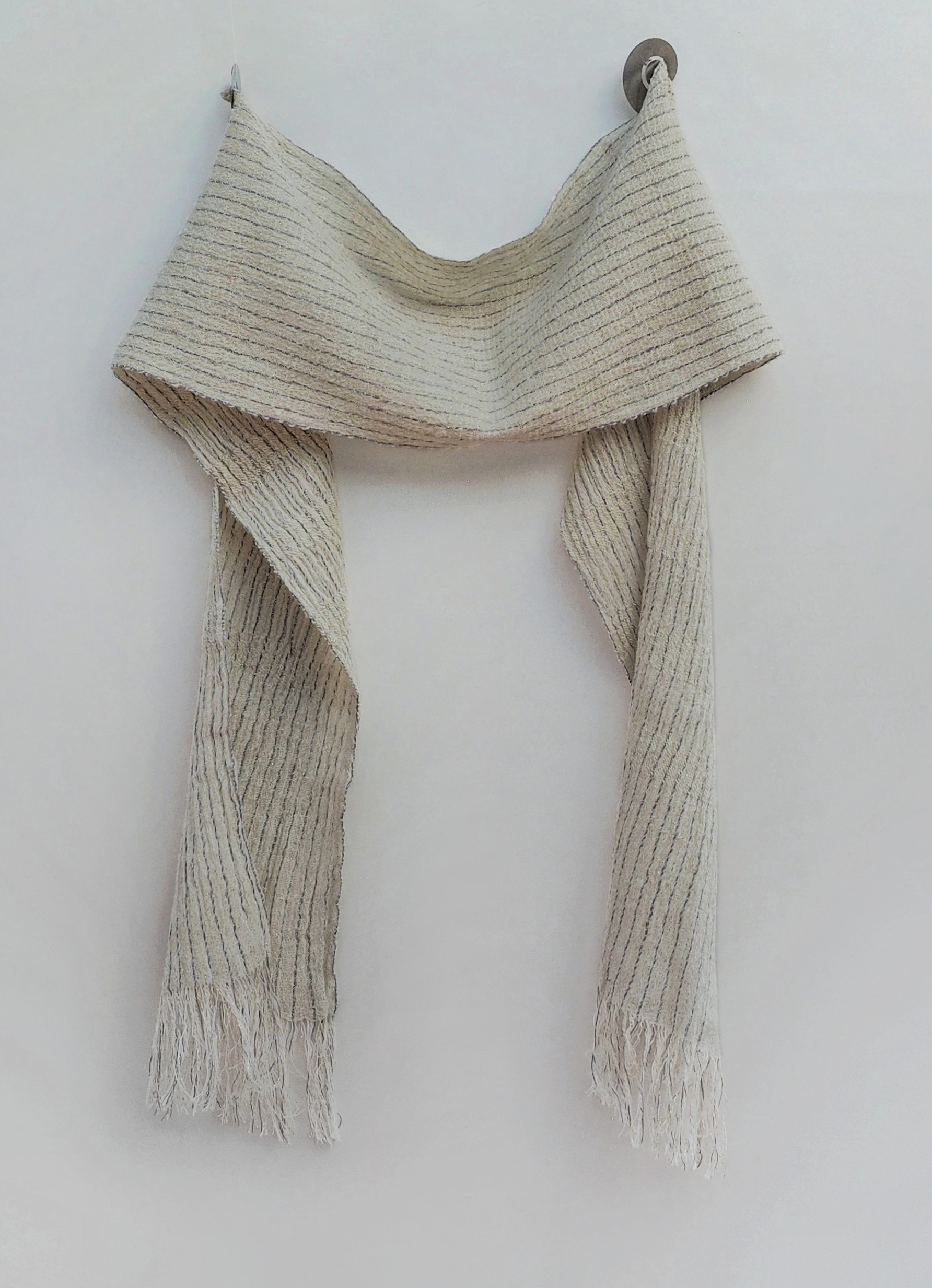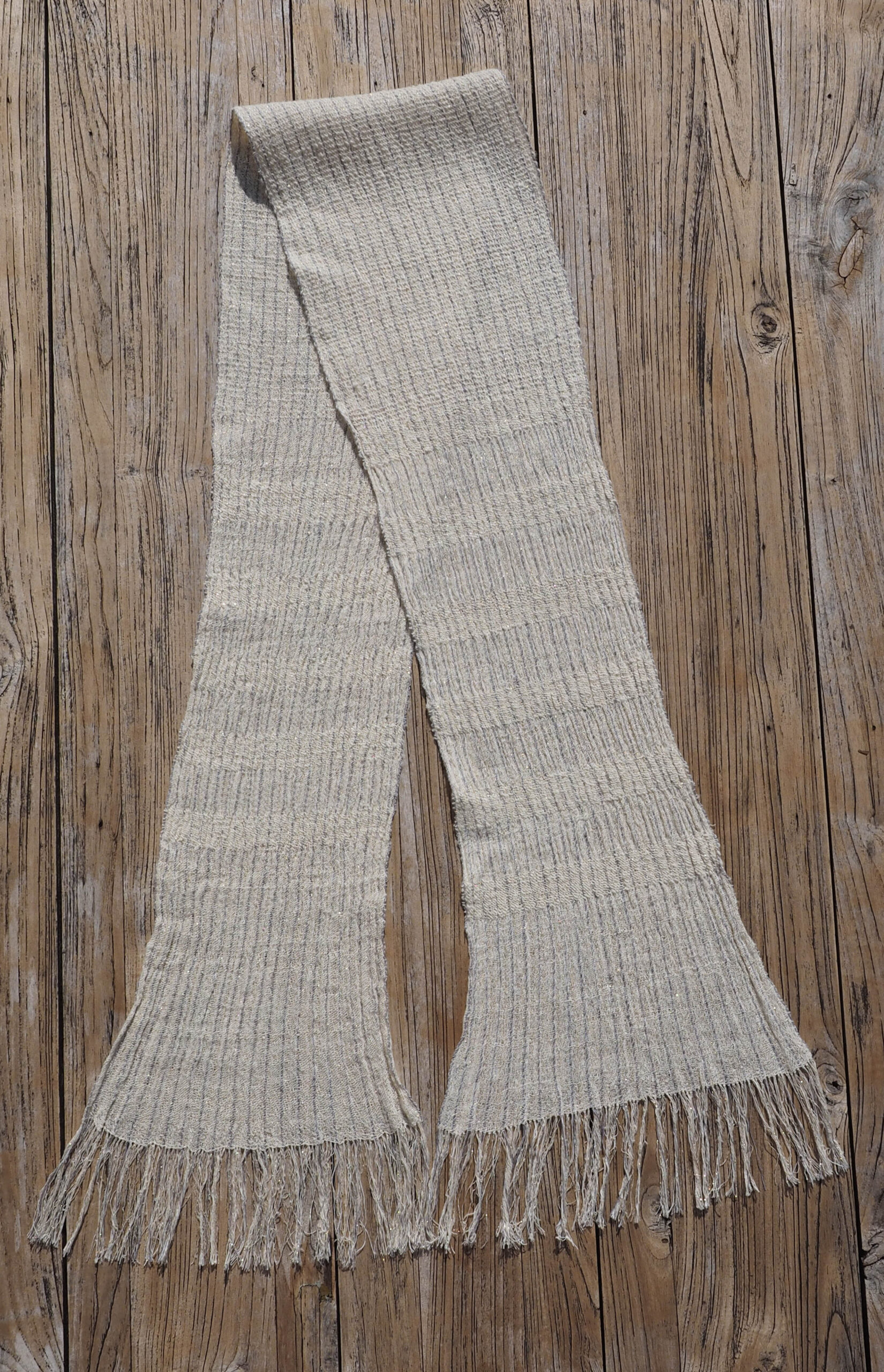 Durch den Einsatz überdrehter und unterschiedlich dicker, handgesponnener Wollgarne ist dieser Schal in der Breite elastisch und hat eine schöne Struktur. Die Enden des Schals sind mit weniger überdrehtem Garn gewebt und daher etwas breiter als der restliche Schal.