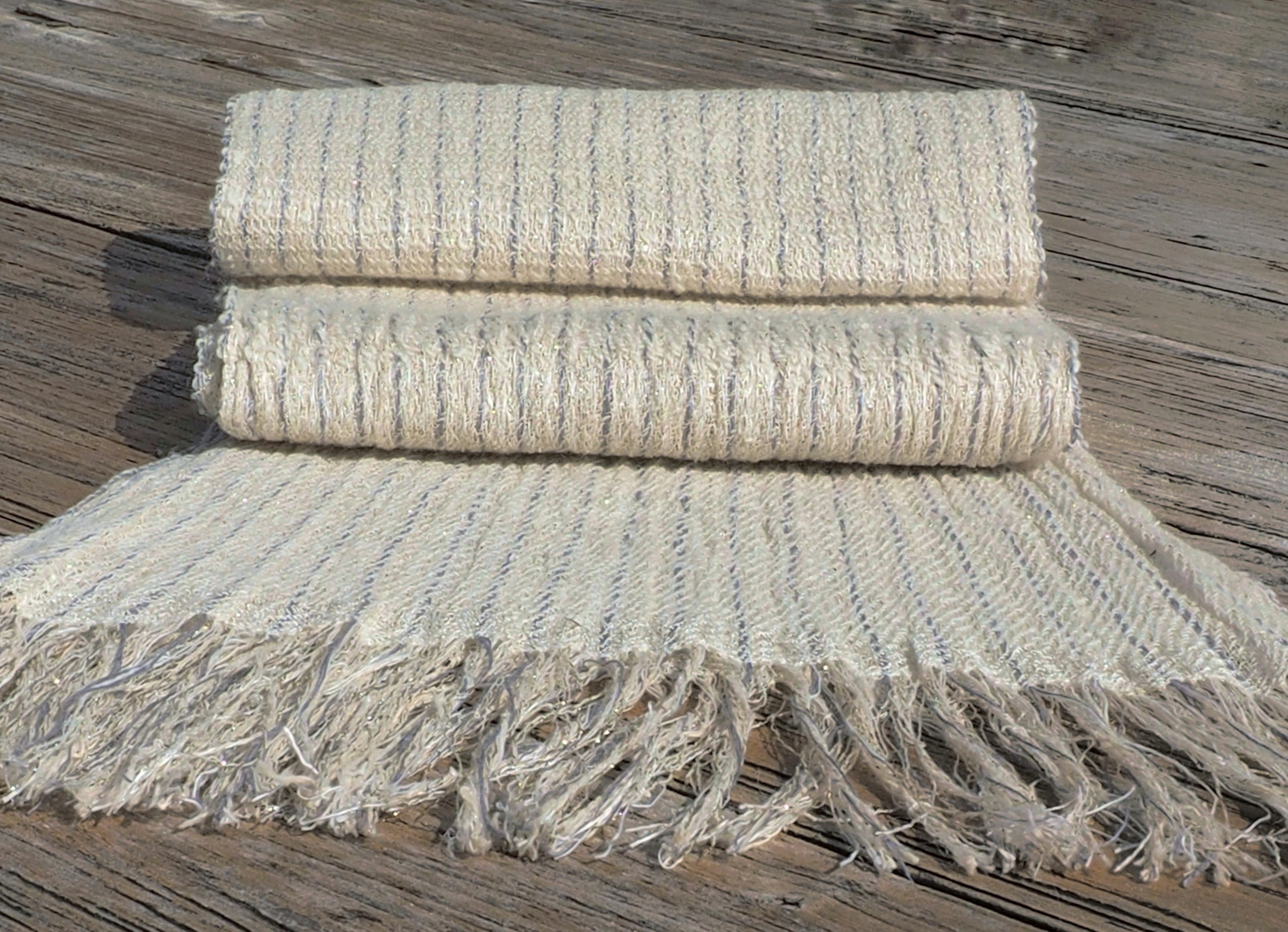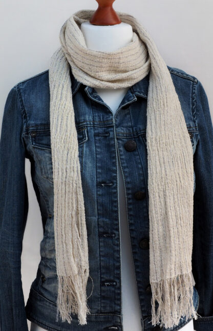 Die handgesponnene Wolle in wollweiß mit den grauen Seiden- und goldenen Glitzerfäden trägt sich sehr angenehm auf der Haut.